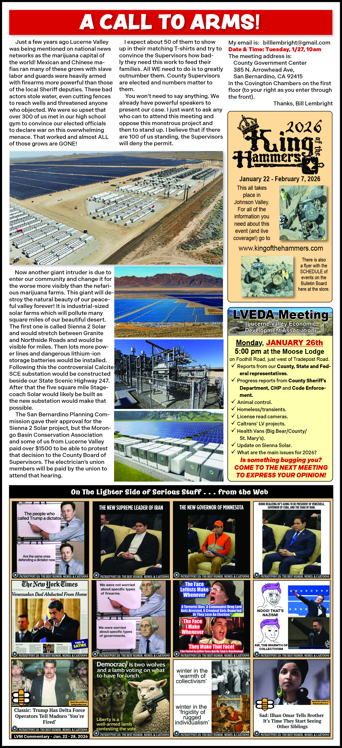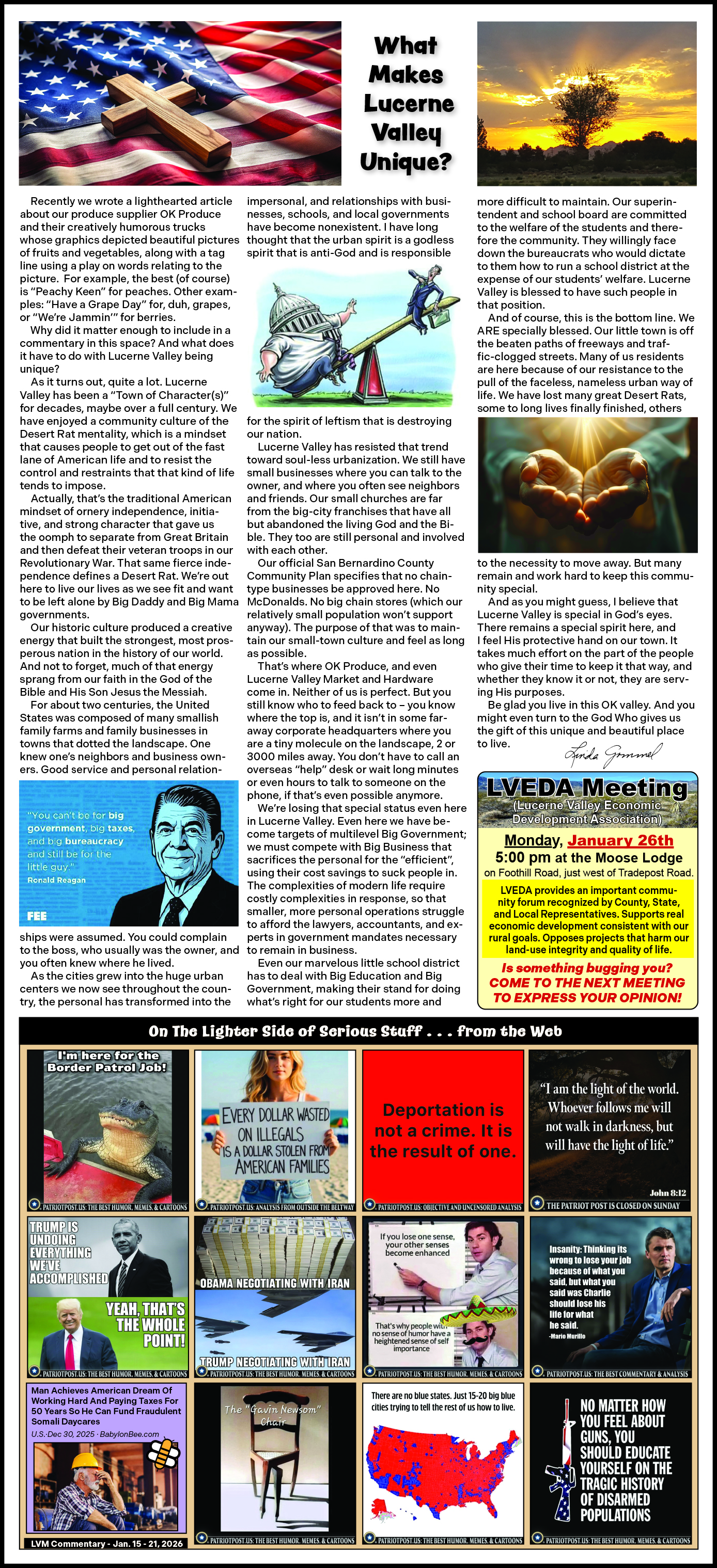 Commentaries from the Lucerne ValleyMarket & Hardware weekly Advertiser January 29, 2026 -- Are We "Good People" or God's People? January 22, 2026 -- A Call To Arms January 15, 2026 -- What Makes Lucerne Valley Unique? January 8, 2026 -- You Gotta Laugh January 1, 2026 -- PRODUCE! and more...