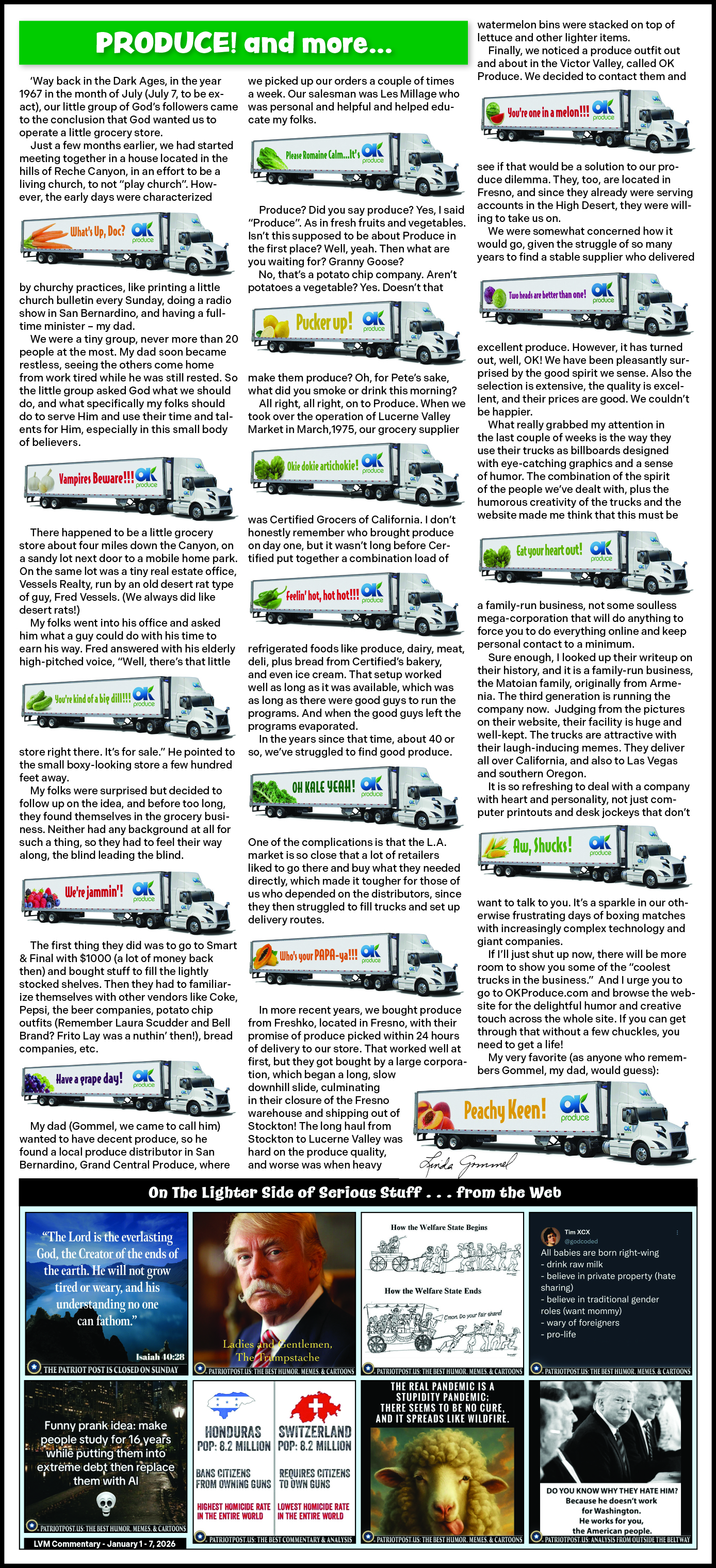 Commentaries from the Lucerne ValleyMarket & Hardware weekly Advertiser January 15, 2026 -- What Makes Lucerne Valley Unique? January 8, 2026 -- You Gotta Laugh January 1, 2026 -- PRODUCE! and more...